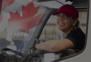 Woman smiling in truck cab with canadian flag